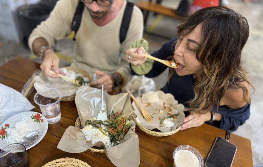 We’ll sip on a delicious and refreshing coconut mocktail, meeting friendly faces who set up their shops here everyday, while following the scent of sizzling satay and fragrant spices, weaving through the market’s fresh food stalls. Your guide will curate a selection of tastings for you to enjoy—from gado gado to nasi campur—sharing stories of flavour and tradition. With options for vegans, vegetarians, and omnivores, there’s something for every palate.